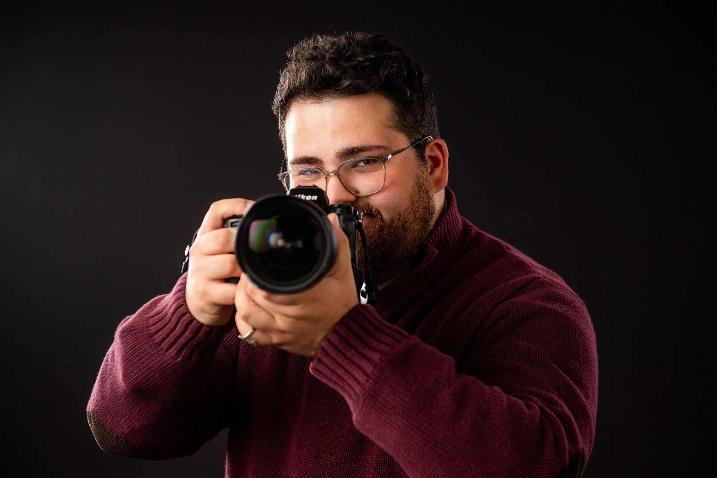 Photographer wearing glasses, taking a picture with a DSLR camera, wearing a maroon sweater, on a dark background.